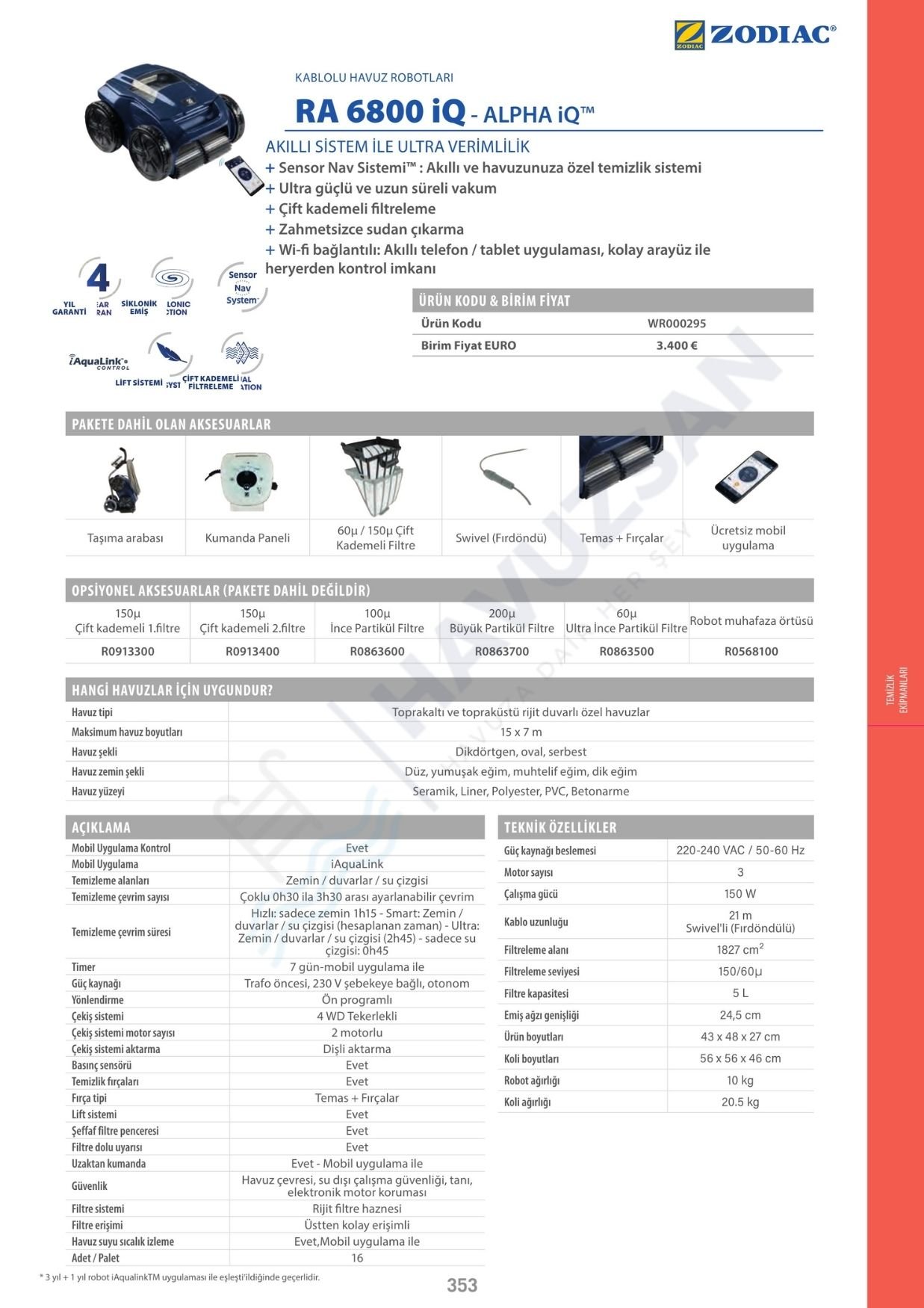 Zodiac RA 6800 iQ Havuz Robotu Teknik Özellikleri