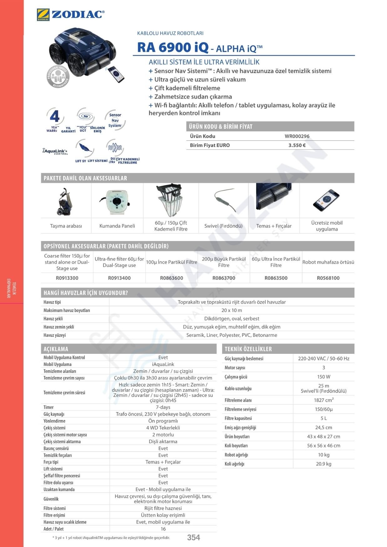 Zodiac RA 6900 iQ Havuz Robotu Teknik Özellikleri