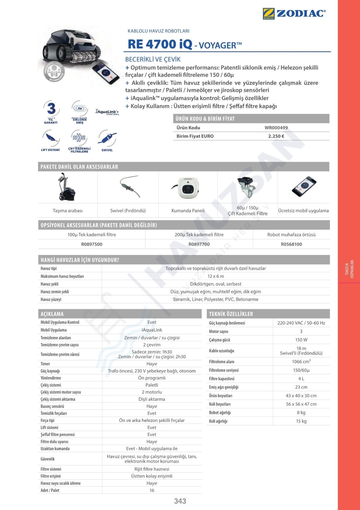 Zodiac RE 4700 iQ Havuz Robotu Teknik Özellikleri