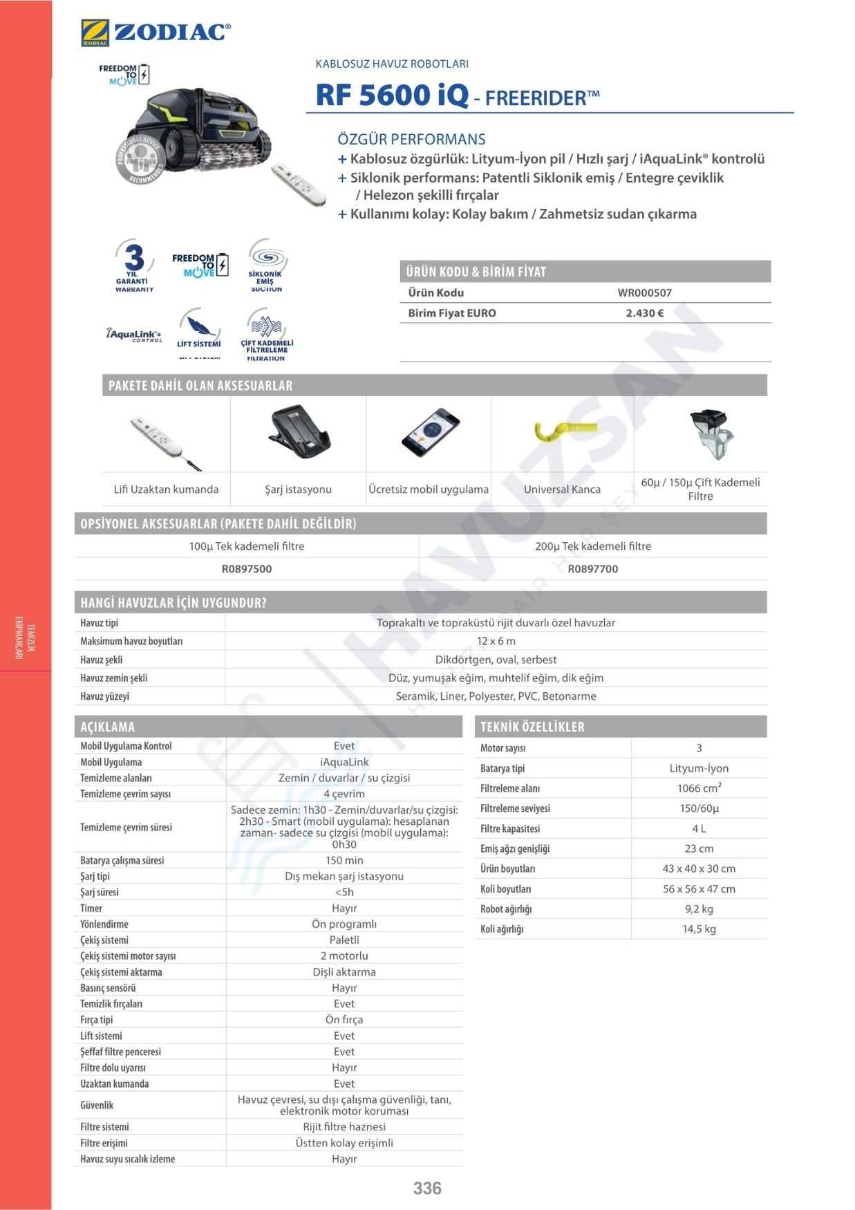 Zodiac RF 5600 iQ Kablosuz Havuz Robotu, Freerider™ teknolojisi ile geliştirilen ve havuz temizliğini tamamen kablosuz hale getiren üst segment bir Zodiac havuz robotu modelidir. Güçlü Lithium-Ion batarya ile çalışan bu robot, kablo sınırlaması olmadan havuz içerisinde özgürce hareket eder ve gelişmiş siklonik emiş teknolojisi ile etkili temizlik performansı sunar.